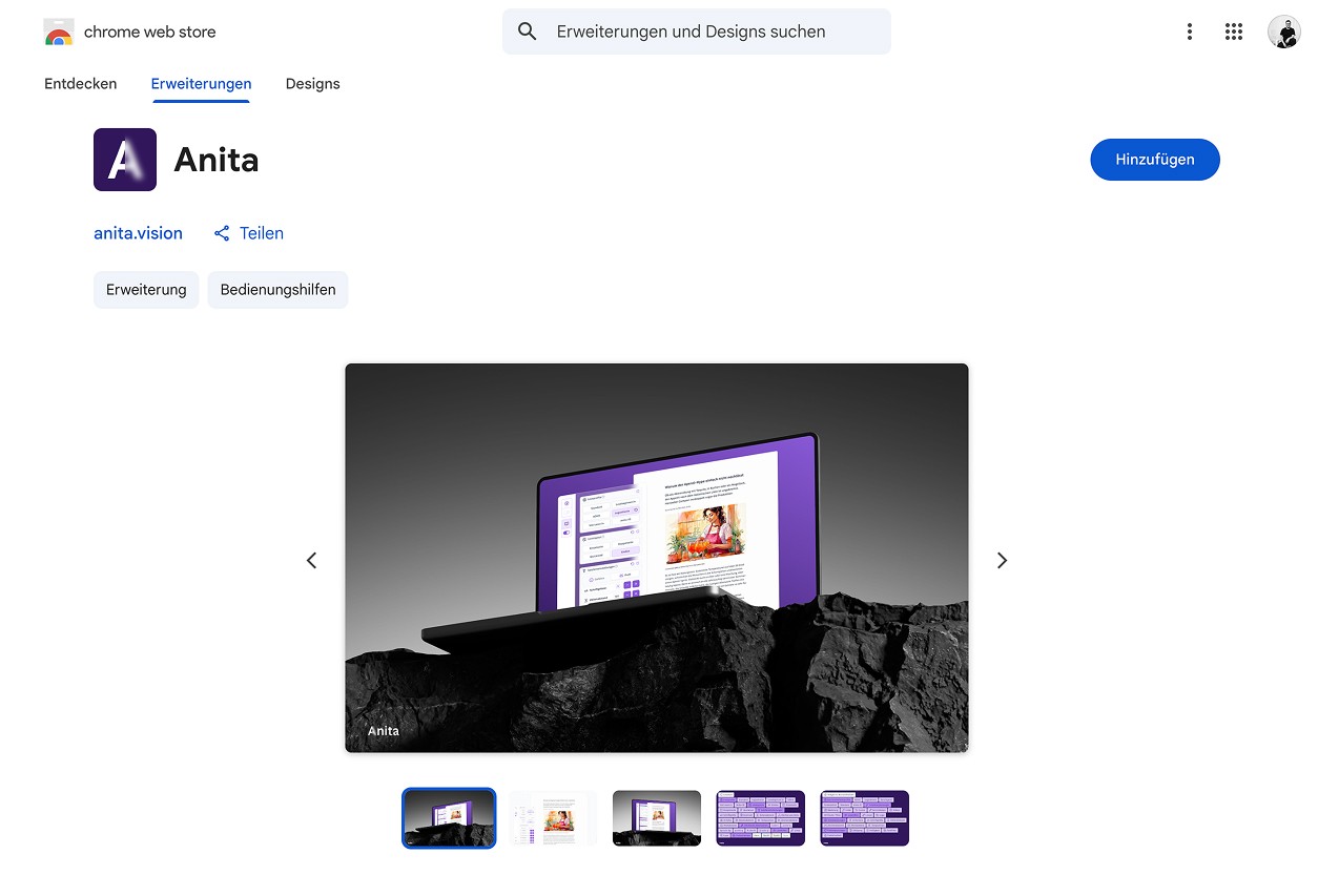 Öffne in einem unterstützten Browser, diese Seite: app.anita.vision/setup. Folge dort den Anweisungen und klicke anschließend im Chrome Web Store auf den blauen „Hinzufügen“-Button. Die Anita-Erweiterung musst du nur einmal installieren – danach aktualisiert sie sich automatisch.